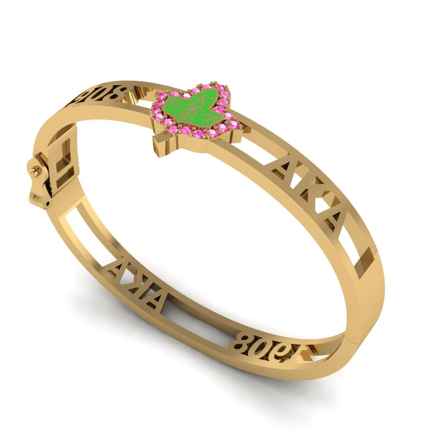Crafted from luxurious 18 karat gold, the bangle is adorned with brilliant pink diamonds, symbolizing the grace and strength of sorority members. Each bracelet can be personalized with specific sorority symbols, colors, and insignias, making it a unique and treasured accessory for sorority sisters.